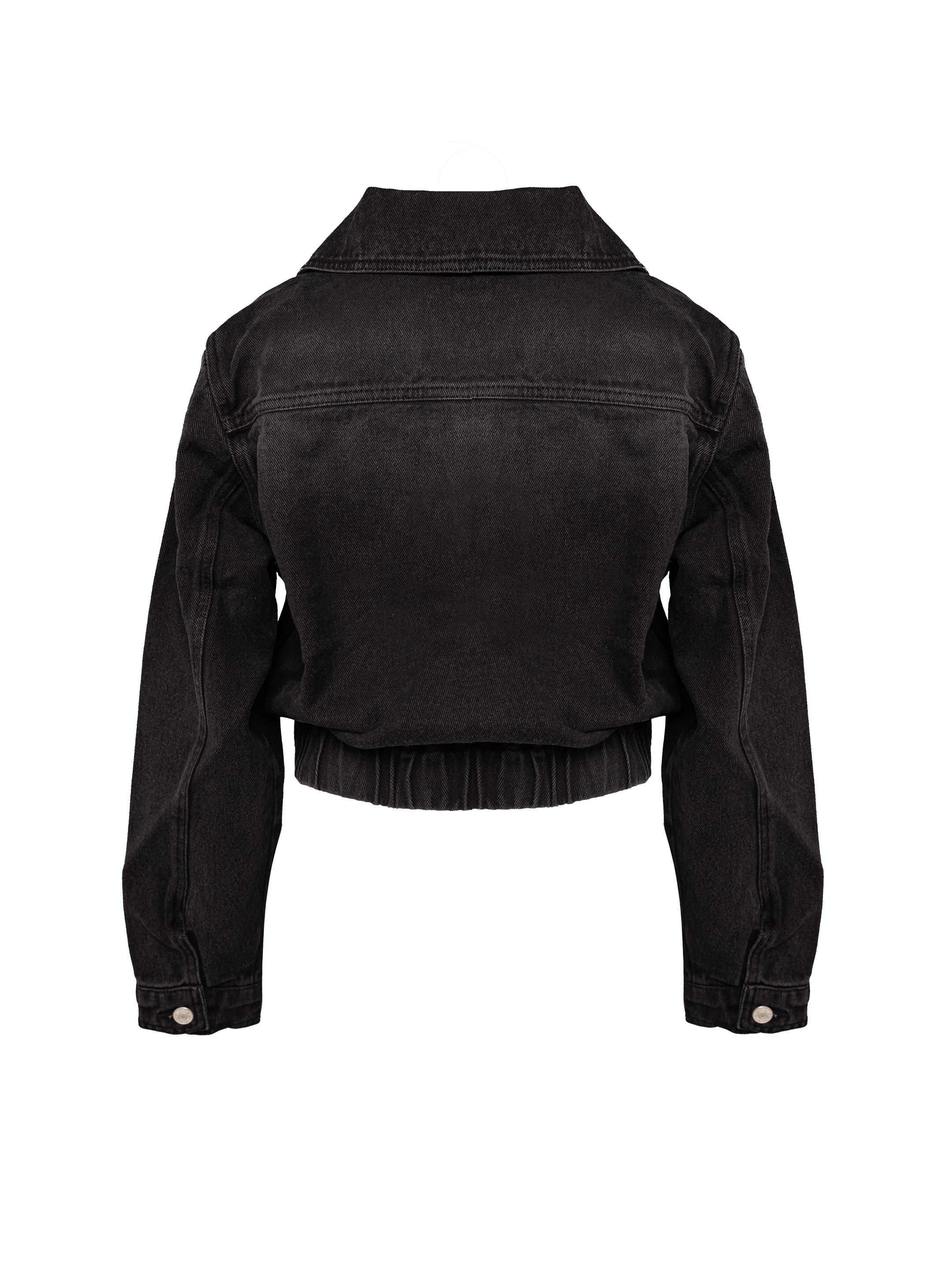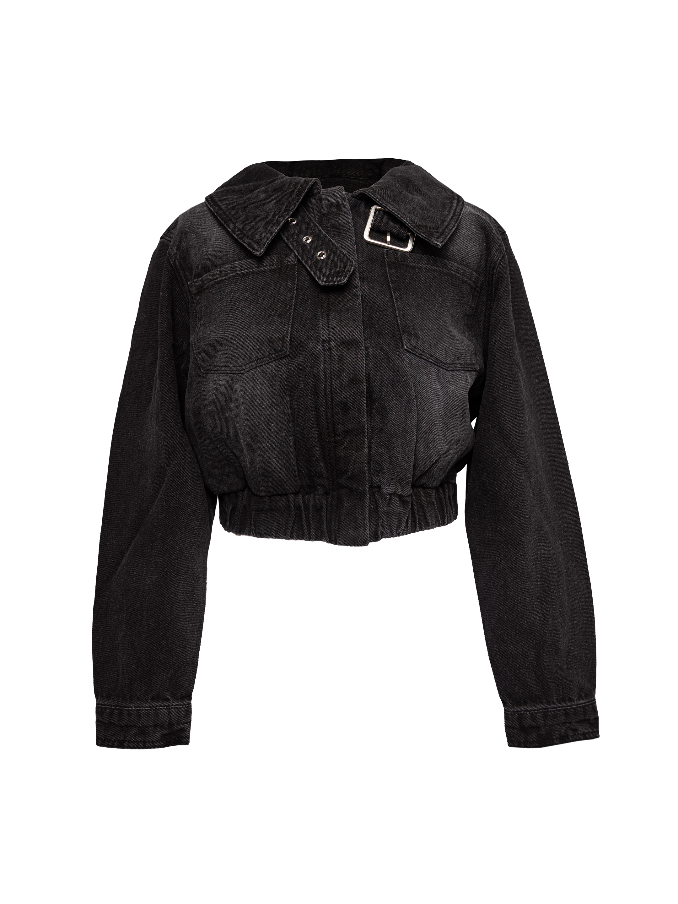 Short black denim jacket with buckle collar, long sleeves and hidden buttons. Designed with two front and side pockets. Made with recycled denim.