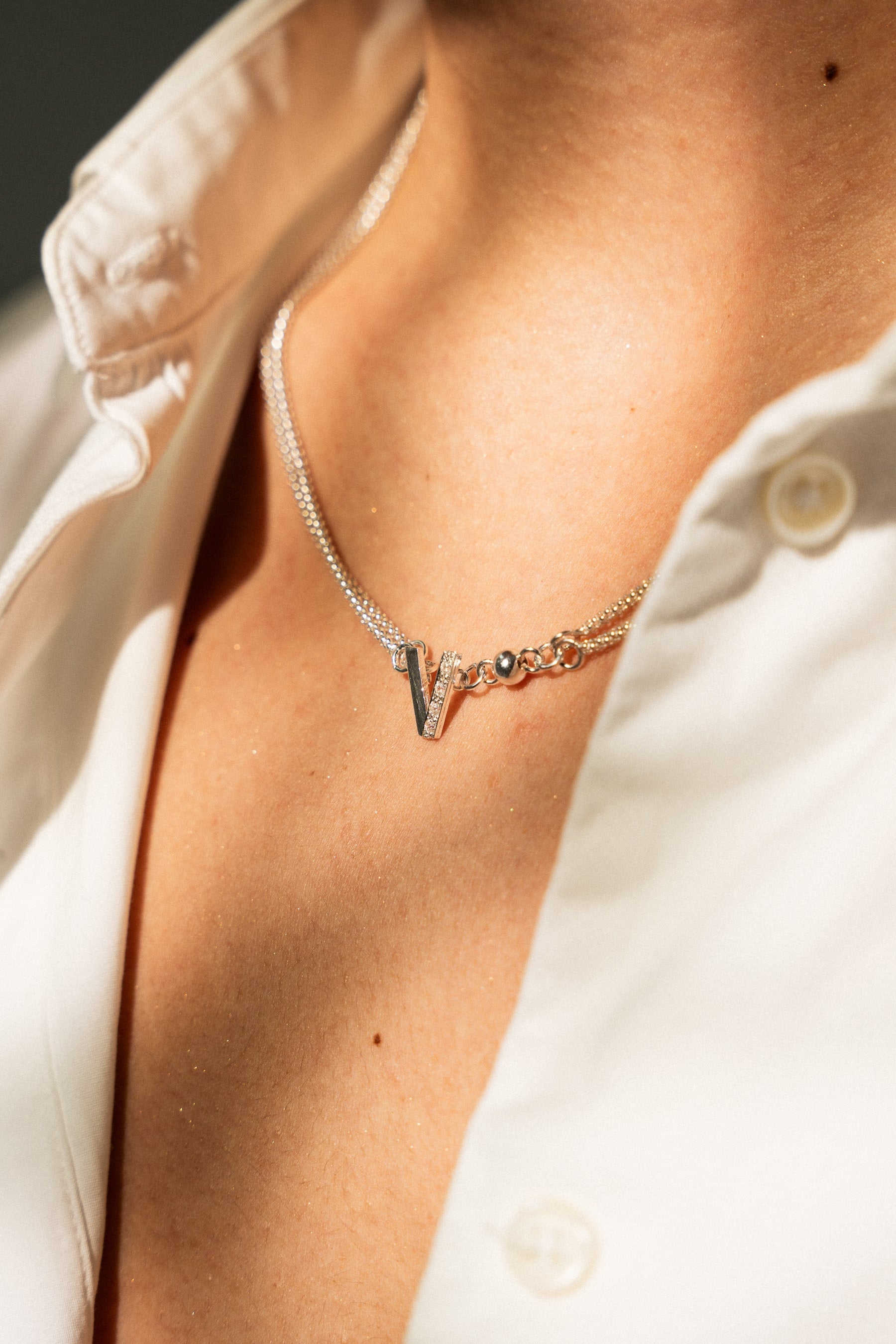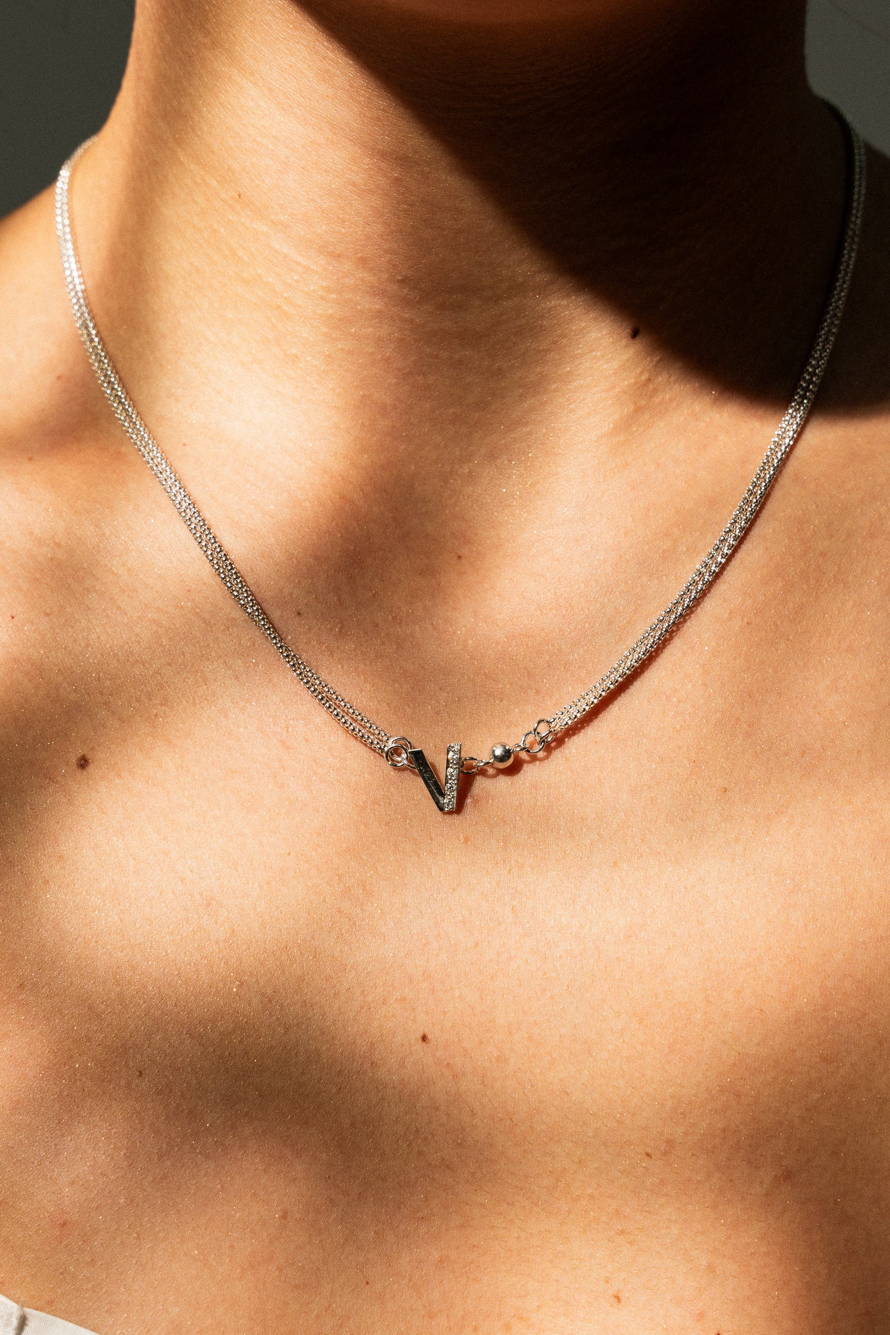 Silver necklace with double strand and small V.