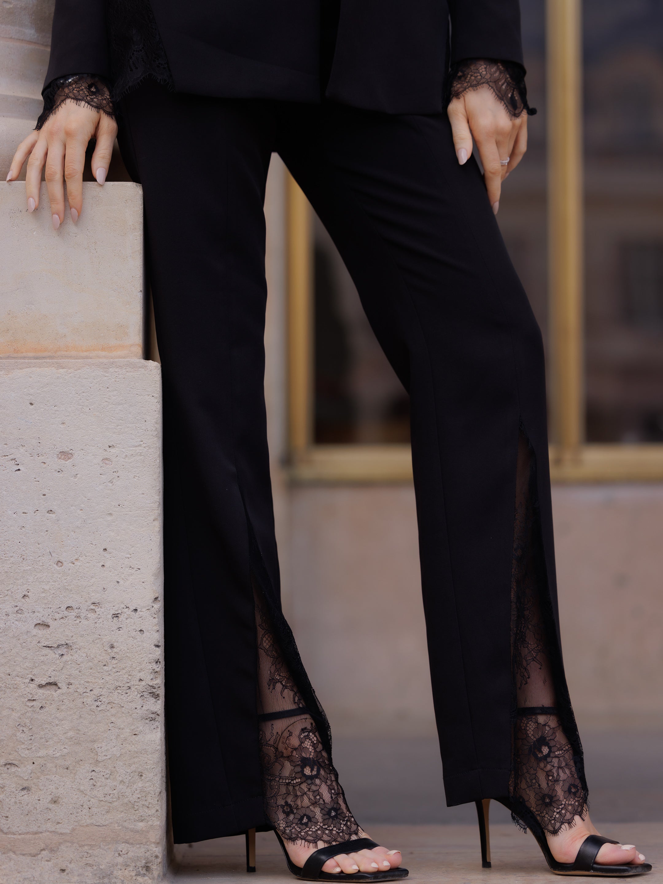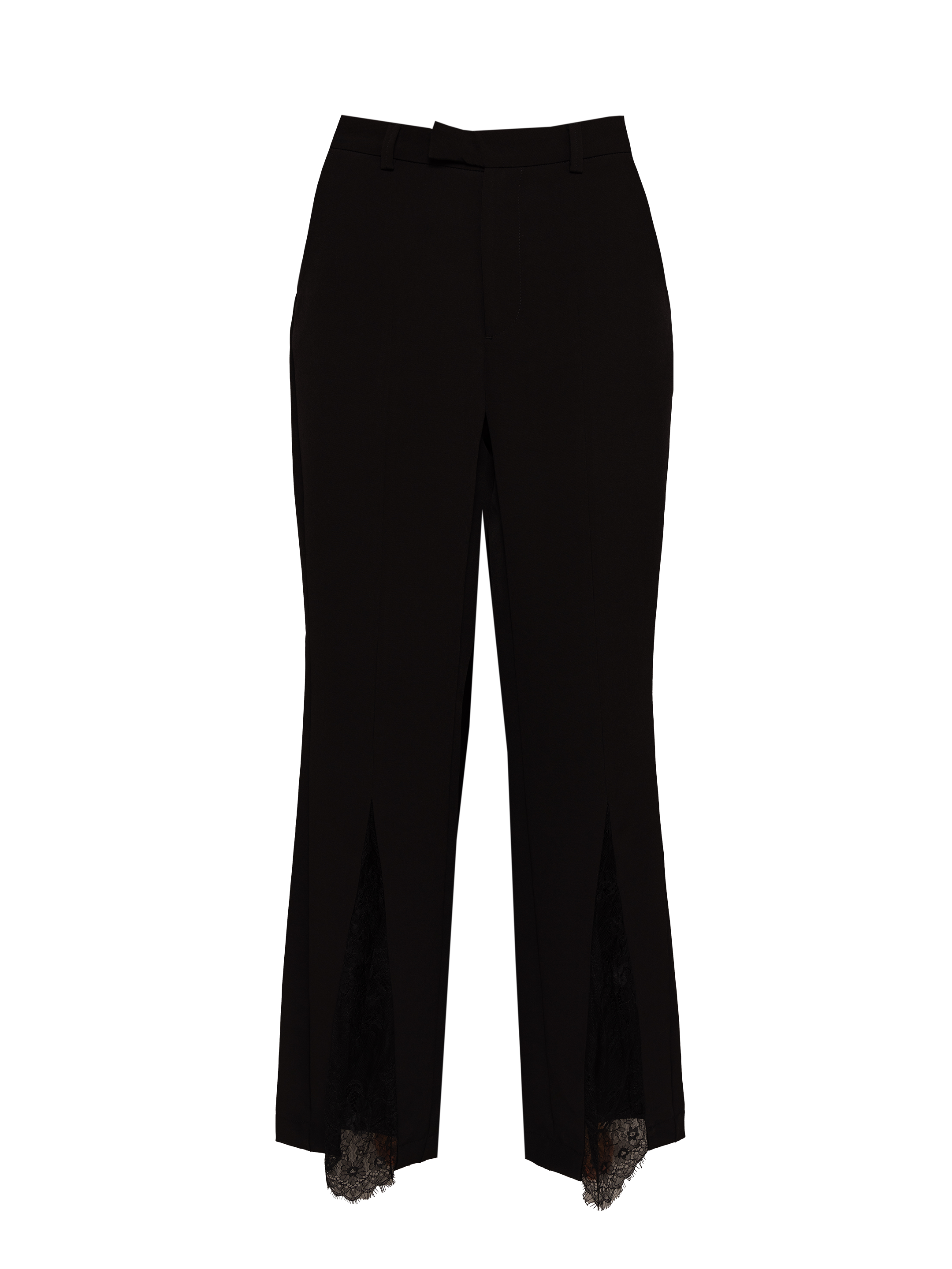 Bell-bottom pants with two pockets at the waist. Designed with a lace trim at the bottom. Tailored with black recycled fabric and black lace.