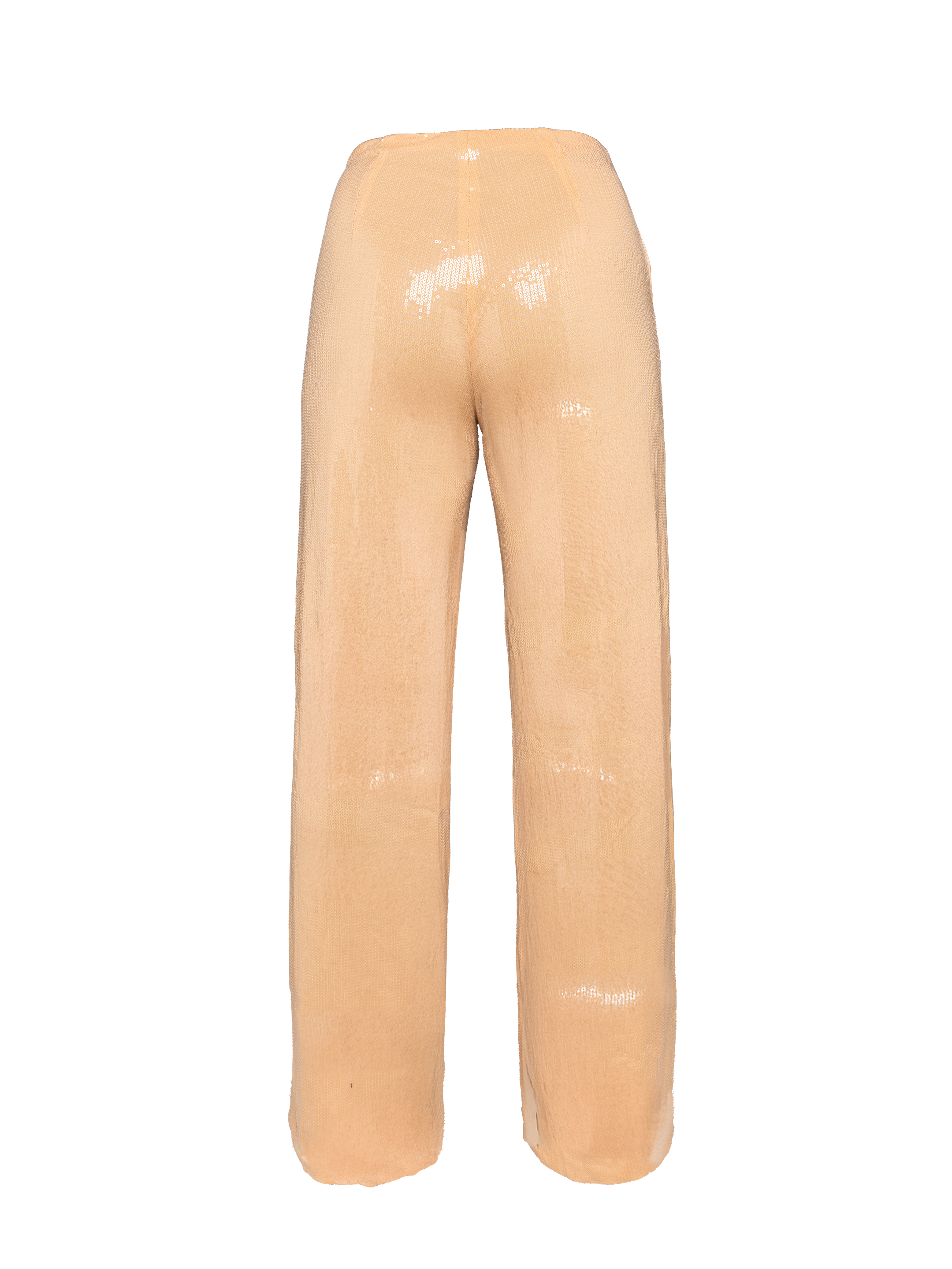 Wide sequin peach pants with two invisible pockets and invisible side zipper.