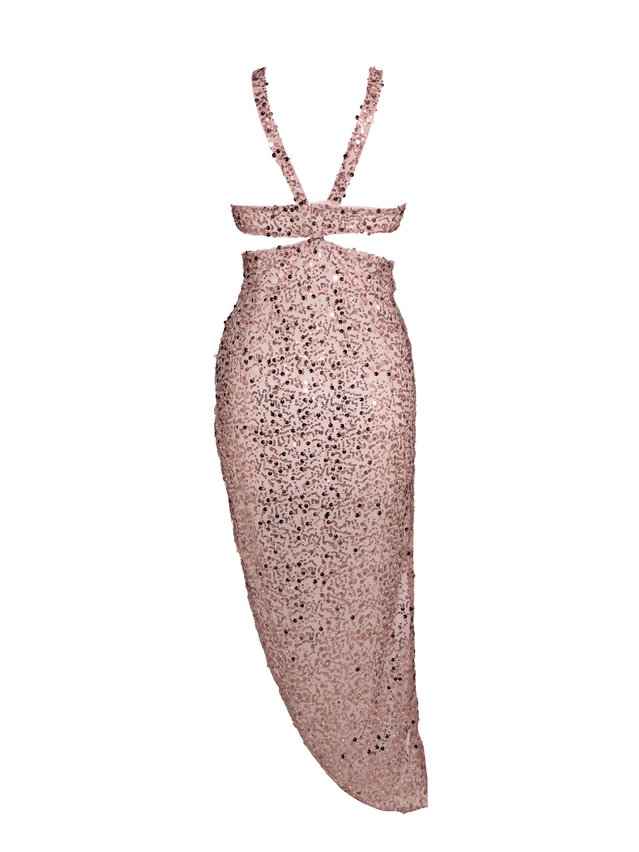 Vestido maxi de lantejoulas rosa bebé com forro macio e fecho invisível. Apresenta uma parte superior franzida no centro, cujo fecho se assemelha a um fecho de sutiã e uma abertura assimétrica na parte inferior.