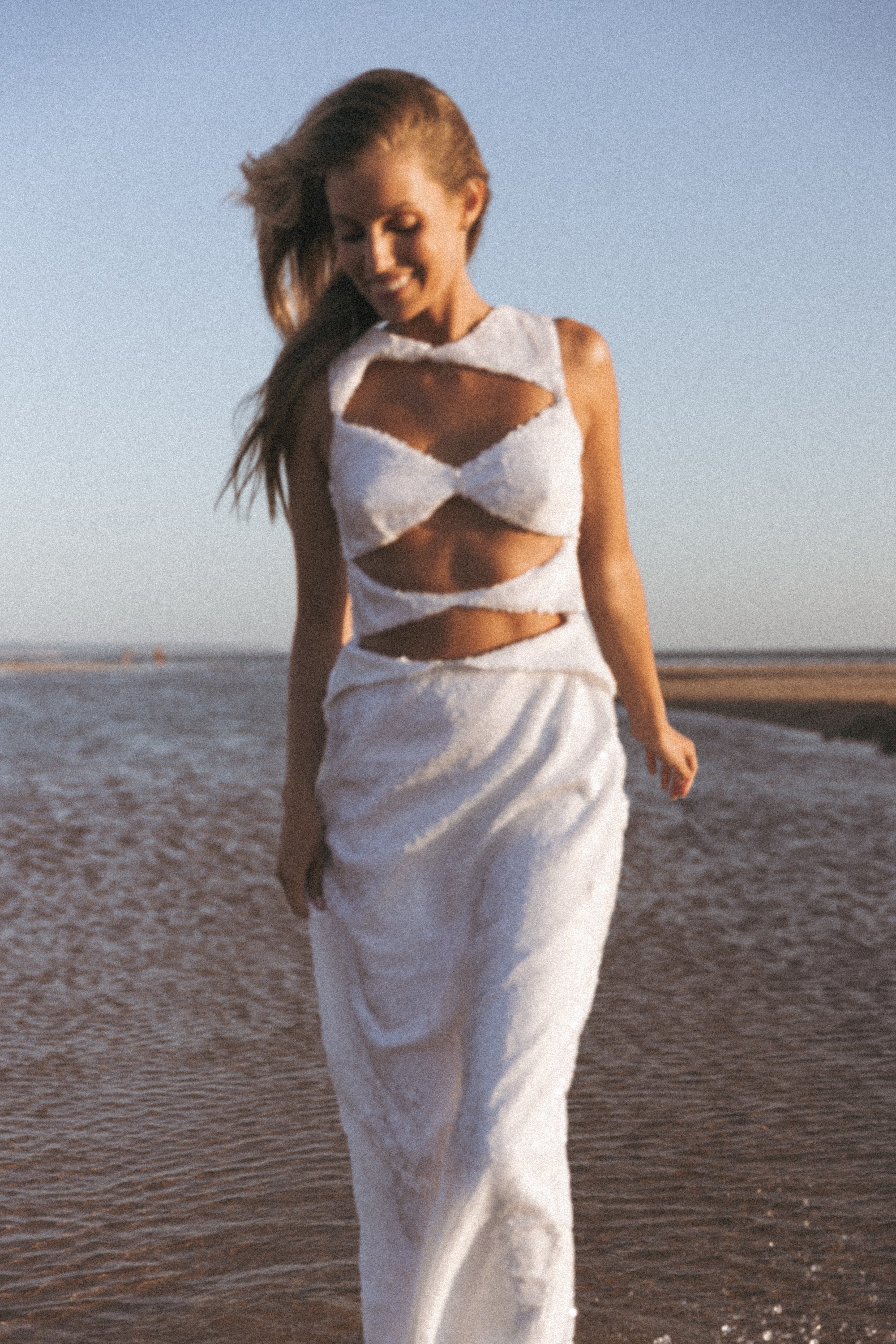 Vestido maxi com fecho de correr invisível. Com um design que possui várias aberturas na parte superior e ainda costas abertas. Confeccionado com lantejoulas brancas recicladas e forro macio reciclado.