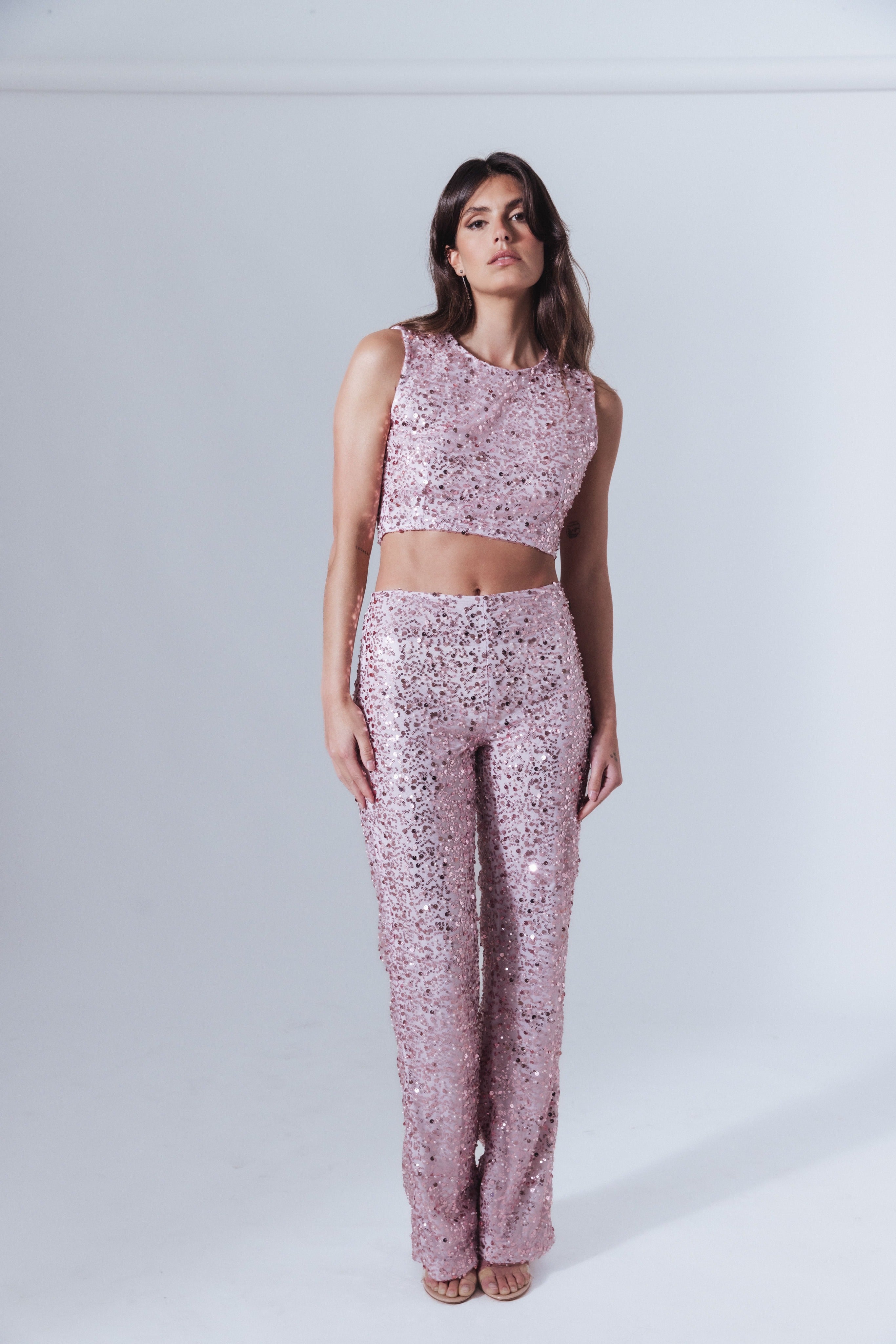 Calças à boca de sino com lantejoulas rosa bebé e fecho de correr lateral invisível.